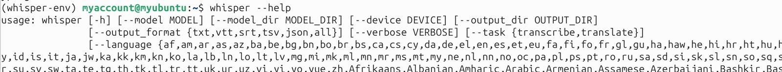(whisper-env) myaccount@myubuntu:~$ source ~/whisper-env/bin/activate && whisper *.mp3 --model small --language French
