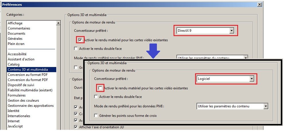 Il peut être utilise de forcer le rendu software d'acrobat pour ne pas faire appel à la carte 3D.