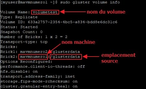 Les infos nécessaires sont données par la commande sudo gluster volume info