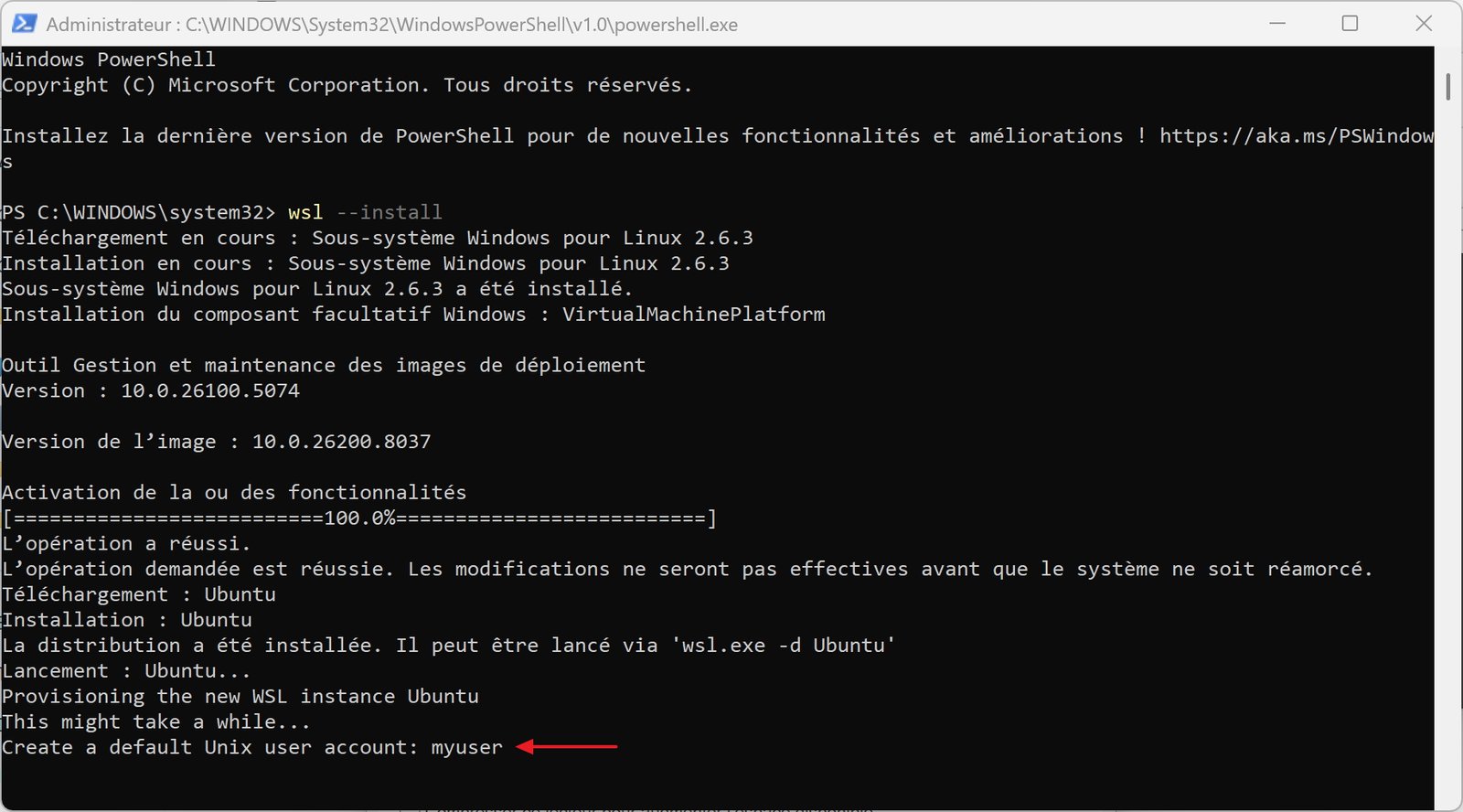 pour disposer des commandes Linux on peut installer WSL (Windows pour Linux) en lançant la commande ci-dessous dans une console Powershell lancée en mode administrateur