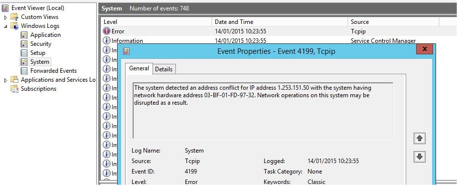 Dans le journal système, un event id 4199 indique que vous avez un problème de conflit d'adresse ip