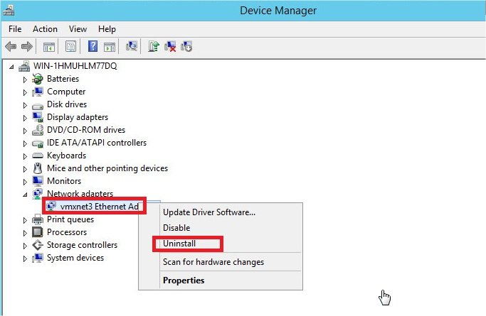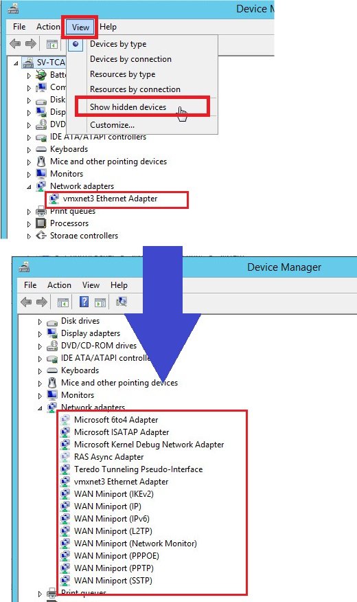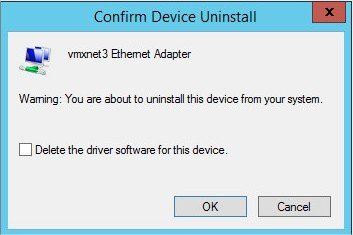 Dans le cas présent la VM sort juste d'un clonage. Nous avons donc de la marge de manoeuvre. n'est pas encore bb Comme indiqué dans la KB256620, allez dans le device manager et supprimez votre carte réseau pour que sa conf