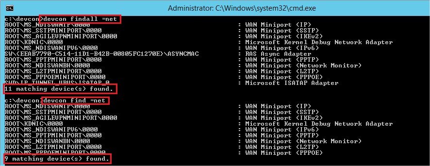 Si le problème persiste, confirmez éventuellemet avec Devcon si il n'y a pas de carte réseau cachée. Ici après comparaison on ne voit pas de carte réseau du bon type qui peut poser problème
