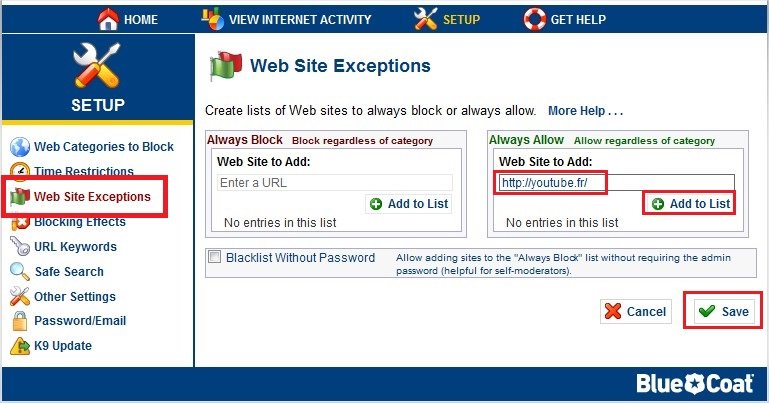 Si vous souhaitez autoriser un site malgré le fait qu'il fasse parti d'une catégorie interdite, cliquez sur 'WebSite Exceptions', indiquez l'adresse du site à toujours autoriser dans 'Always Allow', cliquez sur 'Add to list' puis sur 'Save'