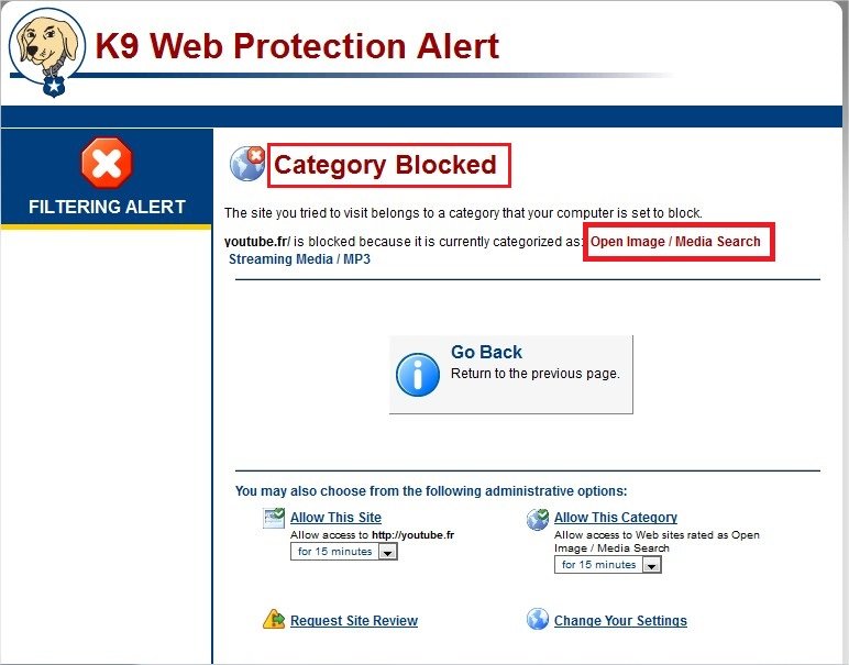 Vous constaterez que son accès est interdit. En effet vous êtes avec le réglage par défaut. K9 indique que le site est bloqué car il est classé dans 2 catégories dont 'Open Image / Media Search' qui est interdit et qui apparait en rouge. L'autre catégorie, Streaming Media / MP3, apparait elle en bleue car elle est autorisée.