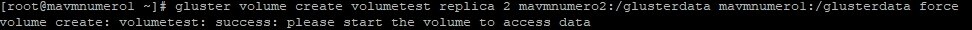 sudo gluster volume create volumetest replica 2 mavmnumero2:/glusterdata mavmnumero1:/glusterdata force