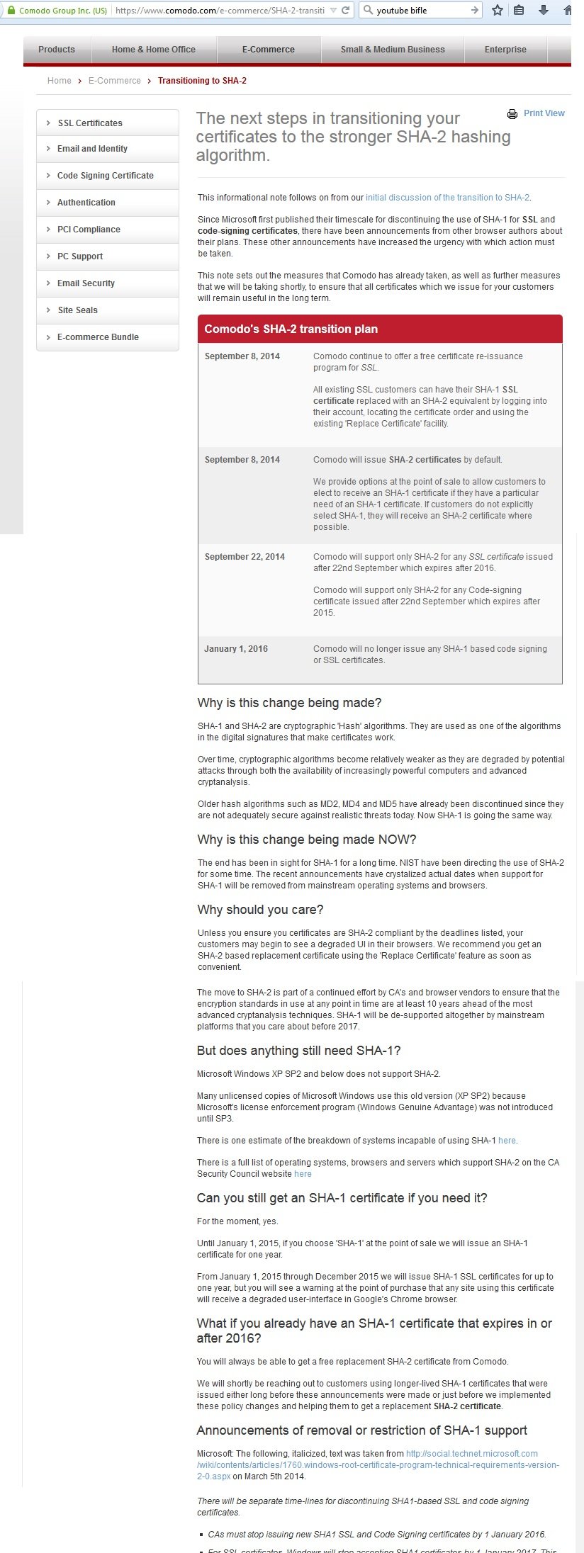 Capture d'écran d'un article du site Comodo.com expliquant la stratégie de migration vers SHA-2 ainsi que le pourquoi :