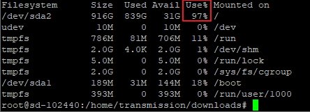 On voit par exemple ici que /dev/sda2 est plein à 97%