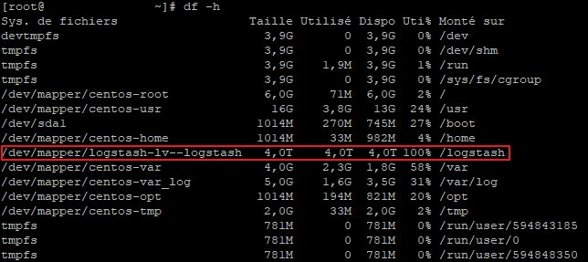 Imaginons que la commande df -h indique que notre montage de logstash est full