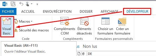Pour avoir accès aux macro VBA sous Outlook 2013, allez dans Fichiers>Options>Personnaliser le ruban Cochez Développeur Cliquez sur Ok