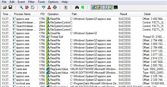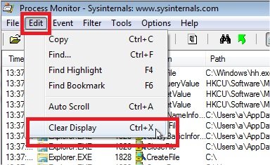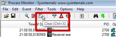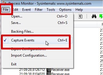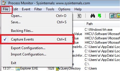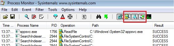 Comme ici on veut trouver un paramètre dans une clée de registre, on va commencer pas cliquez sur ces 3 boutons pour ne pas capturer les évènements sur les fichiers, le réseau et les process