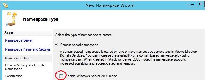 Privilégiez un namespace Domain-based ensuite cliquez sur Next